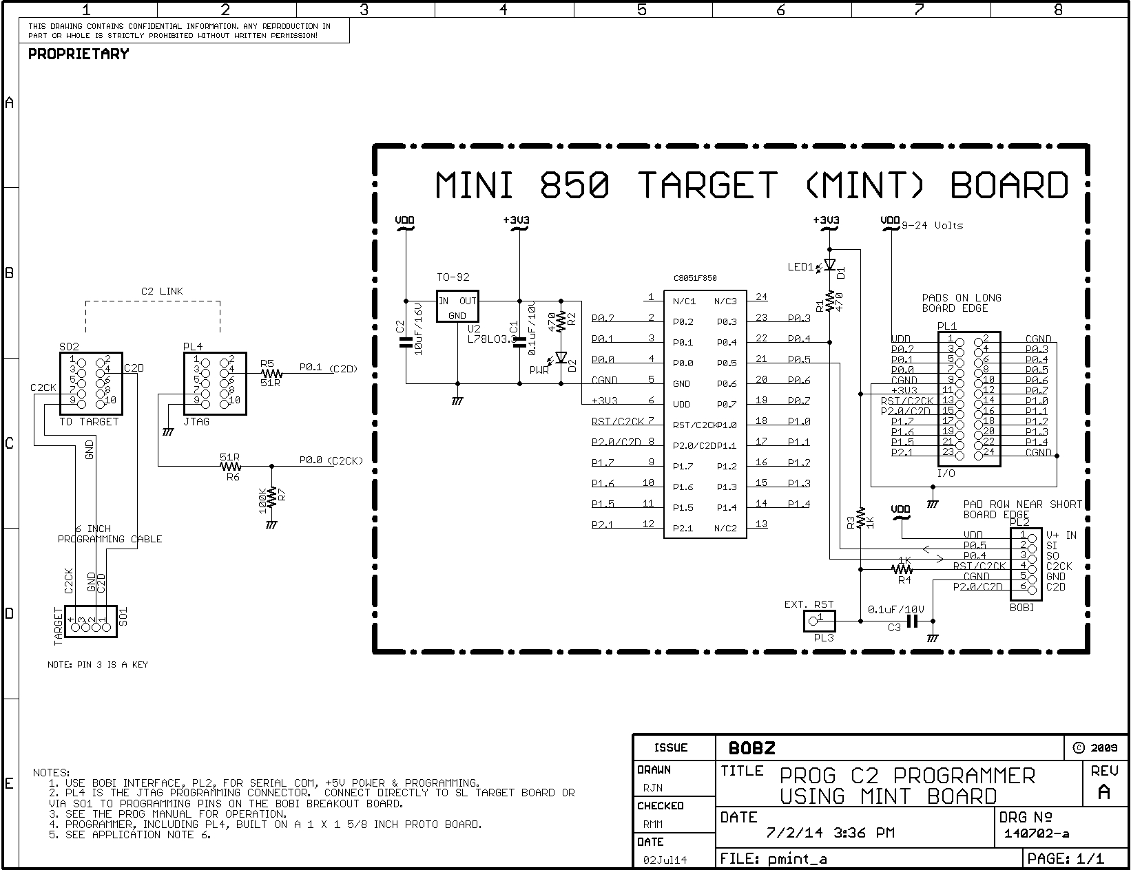 Schematic 1 shows the PMINT connections. Note that only three wires need be brought down to the motherboard from the MINT processor board: ground, P0.0 and P0.1. Also note that the PMINT power and serial connections are available on the BOBI connector.