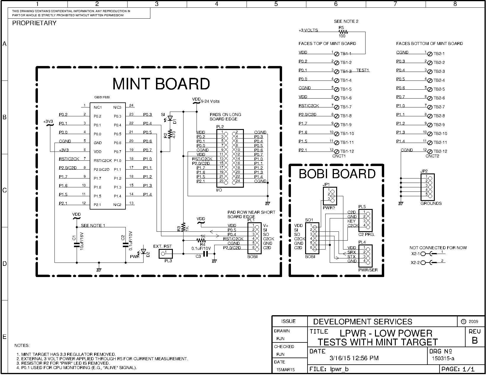 The following documents the results of low power tests performed on a C8051F850 (850) processor. For testing, a MINT board was modified to eliminate the 3.3 Volt regulator and the "PWR" indicator LED. The modified board was mounted on a MINT development platform consisting of a socket for the MINT board and screw-down terminals for I/O connections.