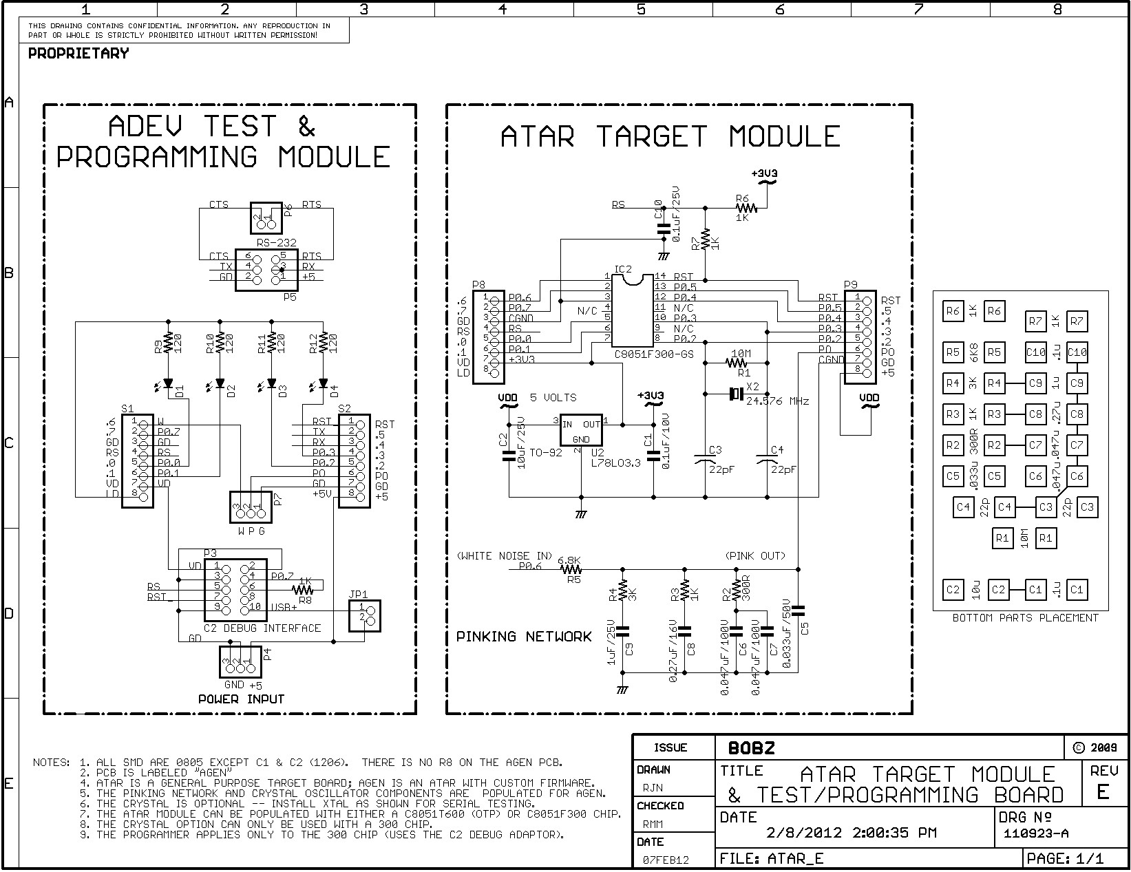 For the following, refer to Schematic 1 titled "ATAR TARGET MODULE & TEST/PROGRAMMING BOARD." The schematic shows the components, circuitry and pinouts for the ATAR module and the wiring of the Test/Programming Board. Also shown is the wiring and board layout for the "pinking" network used for the AGEN Module. In other applications, the pads for this network can be used for general-purpose wiring of an RC network or left unpopulated.