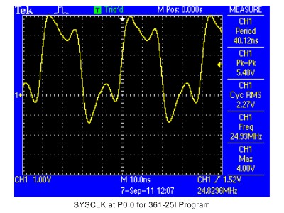 To program the module using the USB Debug Adaptor, bring up the Silicon Labs IDE and select the Connections/Connection Options menu item. This will bring up the connection options dialog. Select the "c2" and "USB Debug Adapter" radio buttons and exit the dialog. This is a one-time configuration and need not be changed each time you bring up the IDE. Next, select the Debug/Connect menu item. The module should connect to the IDE, as indicated by a "Target: C8051F300" indication at the bottom of the IDE's screen. Once connected, the chip can be programmed by selecting the Debug/Download Object File option. This will bring up a dialog that allows you to erase the chip (always do this) and download an object file from a selected directory (i.e., wherever the programming files are located). Once the module has been programmed, select the Debug/Disconnect menu option to disconnect the programmer from the USB Debug Adaptor. To test the programmed chip, connect the serial interface to a terminal program operating a 9600 baud. This will allow you to issue commands that exercise selected port outputs. See the Interactive Test section for details on the use of the serial port to interactively test the module in either the internal or external oscillator configurations. To use the interactive program options given above, an RS-232 level converter must be attached to port pins P0.4 (transmit output from the chip) and P0.5 (receive input from the PC). A number of inexpensive adaptors that perform this function are available on EBay. The Test/Programming Board has a connection footprint that allows direct connection of one of the most popular adaptors (e.g., by soldering the board's stake pins directly to the Test/Programming board). The RS-232 converter can also be attached to the Test/Programming board with a short 10-conductor ribbon cable, as shown in Photo 3. Note that the connection is performed with just the first six pins of the cable connectors (the remaining pins are not used). Ensure that pin 1 of each connector (usually marked with a triangle) connects to the pin marked "VCC" on the adaptor and on the Test/Programming Board. Caution: not all 10-pin cables are assembled in the same way -- we recommend that connections be verified with a continuity tester before initial power-up and use. Connection of the adaptor to the board can vary and comprehensive connection procedures are beyond the scope of this document. Serial Output -- The operation of the serial output of the chip can be verified without an adaptor by connecting an oscilloscope to the port pin labeled ".4" on the ATAR Module (P0.4). If the ATAR Module is installed on the Test/Programmer board, you can observe serial output on the pin marked "RX" on the Test/Programmer Board's RS-232 connection pads. Note that the "TX" and "RX" labels on the Test/Programming board are "PC centric" which is reversed from the normal convention for our schematics. This was done to avoid a conflict between the silk screening on the Test/Programming board and the silk screening on the RS-232 adaptor board. Thus, "RX" is the transmit output from the processor on the ATAR board and is also the receive input to the PC. At startup, when power is first applied to the module, an ATAR Module loaded with one of the test programs (such as adev_25X.hex) will output a string of characters giving the version and configuration. Thus, serial activity on port pin P0.4 at startup will provide a basic indication that the chip has an operable serial port. SYSCLK -- For both program options, the chip's SYSCLK output is routed to port pin P0.0. Observing this pin with an oscilloscope, or measuring it with a frequency counter, verifies that the chip is running. For the 25 MHz crystal option, the SYSCLK output should be at the crystal frequency, as shown by Photo 4 for a 24.576 MHz crystal output on P0.0. If the SYSCLK does not appear, ensure that the output is present without the crystal oscillator circuitry. This can be done by loading the adev_25I.hex programming file. This program option should work even if the crystal oscillator circuitry is inoperable (e.g., a bad crystal or incorrect capacitor values at C3 and C4). Photo 5 shows a typical SYSCLK output at P0.0 when the chip is operating with an internal clock. Note that Photo 4 and Photo 5 are for SYSCLK outputs from the C8051F361 chip on a MUTS Module but the outputs from an ATAR Module should be similar. The LEDs and limit resistors on the Test/Program Board may interfere with serial port testing because the LEDs are attached to P0[2,3] used by the crystal oscillator. To avoid this problem, ensure that the "LD" pin is open and not connected to power or ground. For interactive testing, P0.1 is configured as an error indicator and will rapidly flash an LED connected to it to indicate an error. If LEDs are connected to I/O ports, there may be conflicts with other I/O assigned to these pins. You may resolve these conflicts either by observing pins on a scope with no LED connection to the I/O pin, testing the module with the internal oscillator option or testing the module in a separate test environment (e.g., installed on your application board). The Test/Programming Board provides some testing flexibility but its configuration with indicator LEDs may not be compatible with all interactive test procedures. Serial Connection -- If the SYSCLK output is correct and the serial port appears to be operable, the chip can be verified interactively by connecting it through an RS-232 adaptor to a serial terminal program such as PuTTY. For both of the "25 MHz" options, the connection rate is 9600 baud (8,N,1). Error Indication -- When testing interactively, you may want to connect an LED (through a limiting resistor) to port P0.1. This port pin has been selected arbitrarily to act as an error indicator. When an LED is connected to the P0.1, the LED will rapidly flash when a non-fatal command error is encountered. Note that the Test/