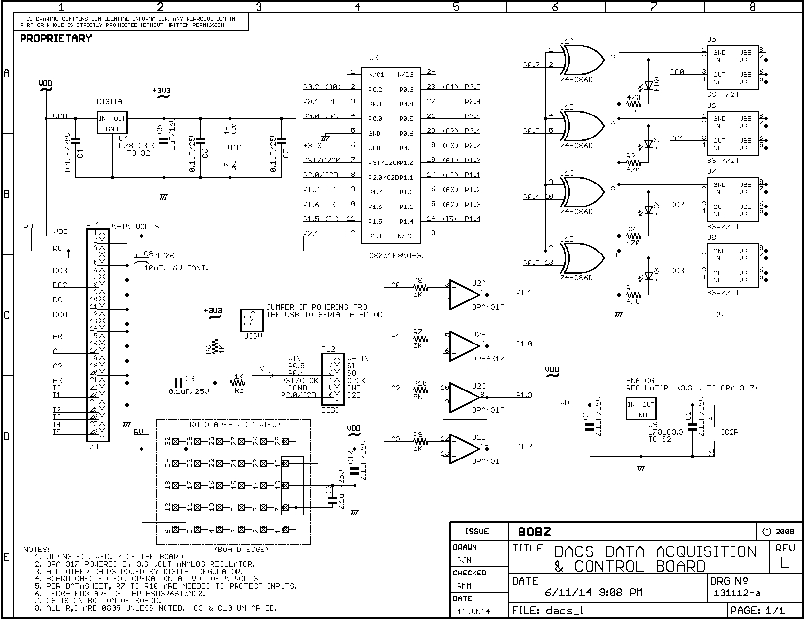 The DACS board uses a Silicon Laboratories C8051F850 processor to manage serial commands from the user and to control various inputs and outputs via connections to its 28 input and output (I/O) pins.