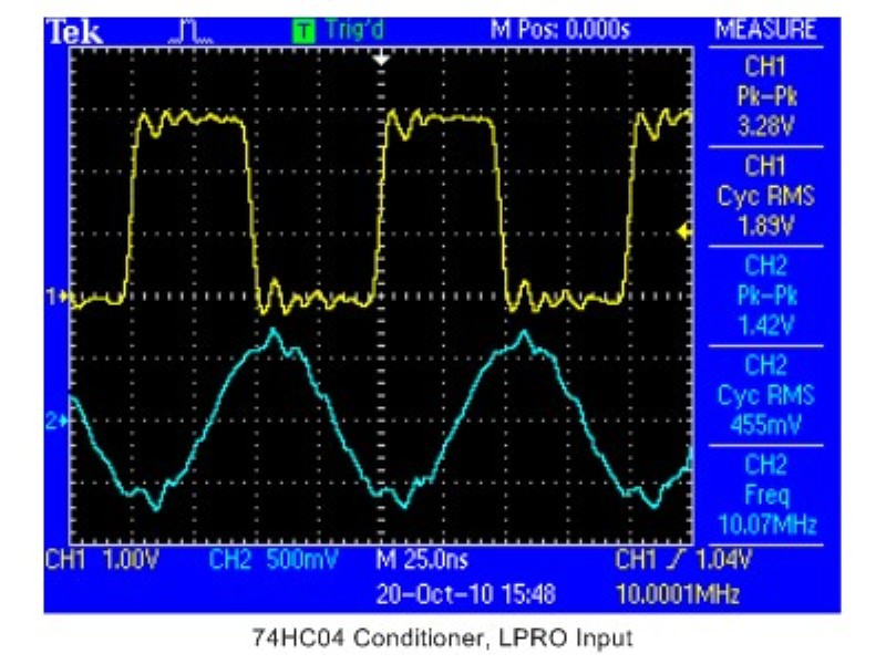 To verify the correct operation of the conditioning circuit, use an oscilloscope to observe the input signal between ground and pin 1 of the hex inverter. If the input voltage is within the range specified above, a 10 MHz square wave can be observed at pins "H", "T" and "V." Buffered versions of the conditioned signal appear at pins "J", "O" and "P" as shown in the schematic.
