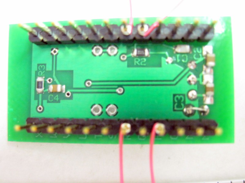 As shown in photo 2, the module measures approximately 1 1/4 by 7/8 inches (32 by 23 mm). Signal connections are provided on two 12-pin single row pin headers. The header connections are labeled "A" to "X" for easy reference. Header pins are spaced one tenth of an inch apart and the header rows are spaced 0.6 inch apart. This allows the module to be used with in-line sockets or wired directly to a protoboard.