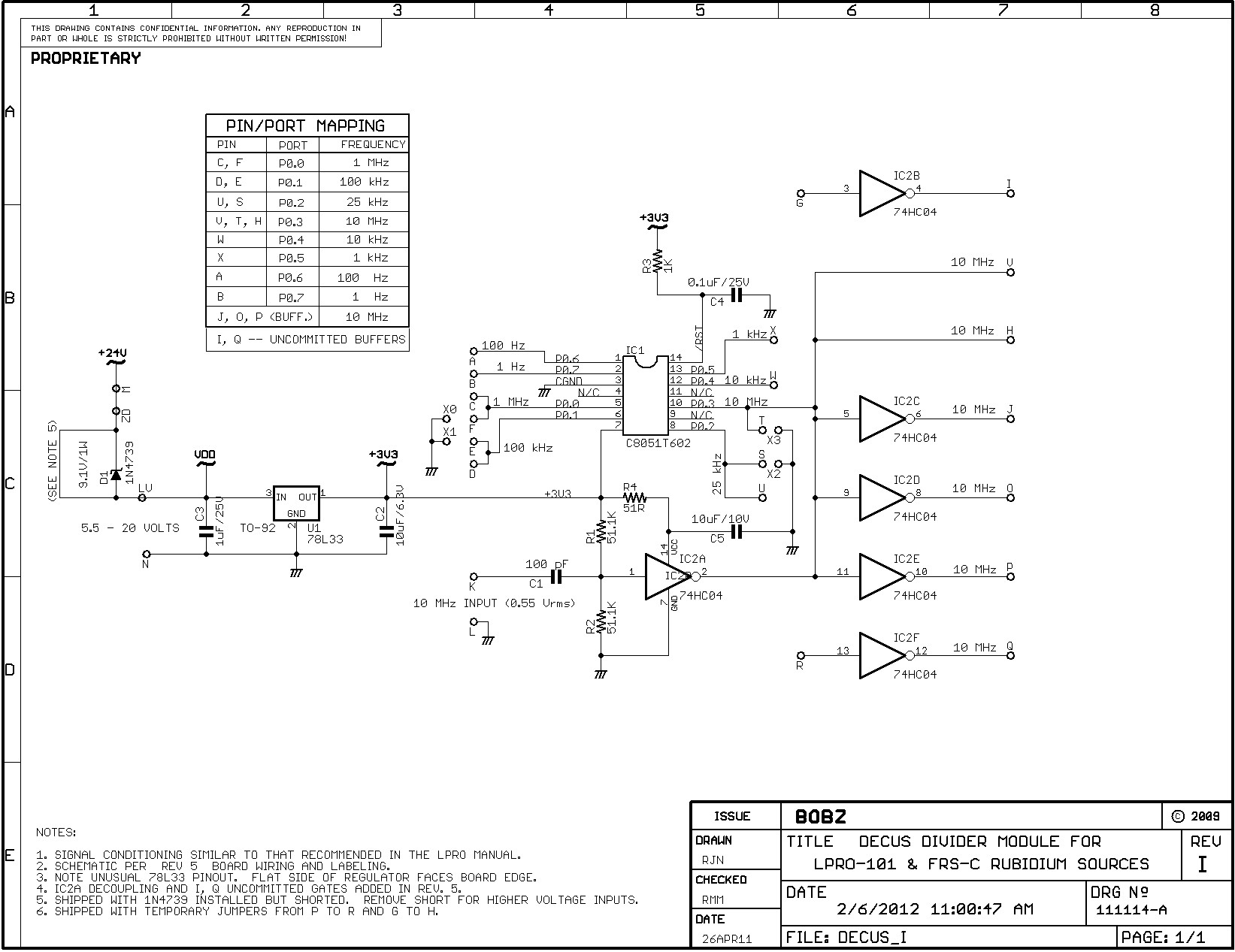The following describes the design, construction, operation and use of the DECUS divider module. Photo 2 shows a top view of the module and Photo 3 shows the bottom. The primary use of the module is to condition the 10 megahertz (MHz) signal from a rubidium oscillator such as the LPRO-101 or FRS-C units manufactured by EFRATOM Ball, Inc. The DECUS module divides the 10 MHz output from these units to produce marker signals at various frequencies.
