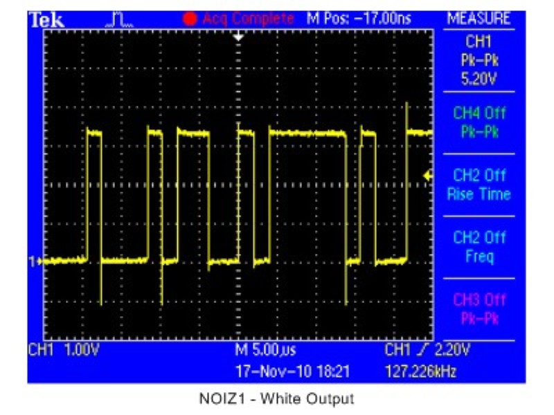 As shown in Photo 1, the white noise signal is at logic levels. Photo 2 shows a narrow spectrum (25 kHz per horizontal division) view of the white noise output. The wide spectrum (250 kHz per horizontal division) output of the white noise is shown in Photo 3.