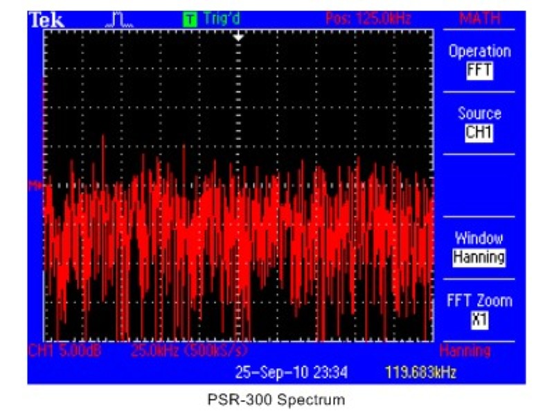 As shown in Photo 4, the pink noise is at a level of a few tens of millivolts for input to an audio system. Photo 5 shows a wide spectrum (250 kHz per horizontal division) view of the pink noise output.
