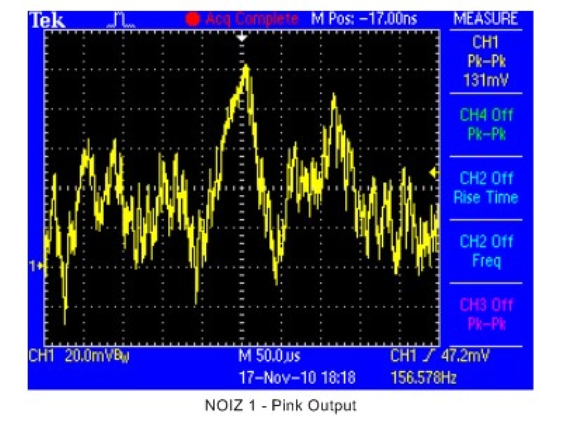 All module outputs are verified on a test fixture before shipment. Outputs are checked for waveform integrity and level with a Tektronix TDS 2014 oscilloscope. The pink noise output is also visually checked by observing correct frequency rolloff with the oscilloscope's FFT display.