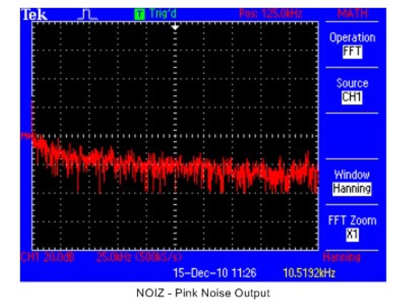 The NOIZ module has been superseded by the AGEN module. The documentation in this section is primarily intended for customers who have previously purchased NOIZ modules. The AGEN module produces both white and pink noise using the same algorithm as the NOIZ module. The AGEN module also generates other audio tones and test sounds. The photos in this section showing the white and pink noise outputs and spectrum are identical to those produced by AGEN. Refer to the AGEN documentation for AGEN specifications and a summary of the differences between NOIZ and AGEN.