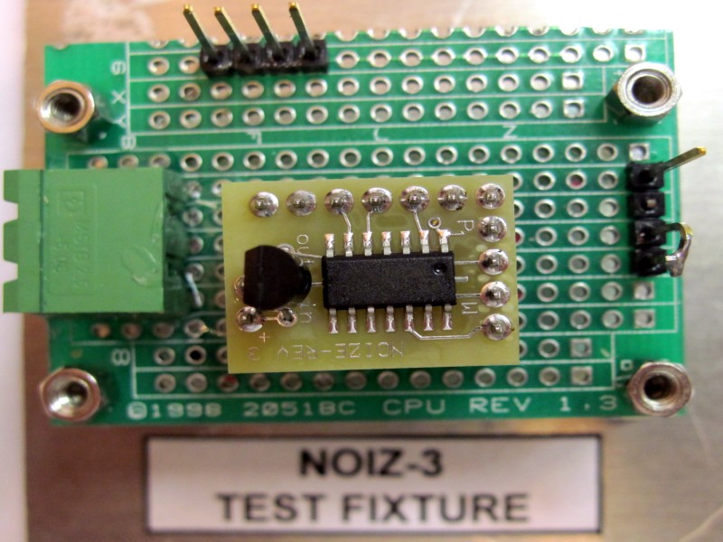 The module measures approximately 9/16" by 13/16" (15 mm by 20 mm). As shown in the schematic, signal connections are available at a single row pin header, J3. Power connections are brought out to a two-pin header, J1. An third 6-pin header, J2, provides connections to the noise module's microprocessor pins and is currently not used except for testing. The microprocessor's system clock, at a frequency of approximately 24.5 Megahertz, is available at pin 3 of this connector.