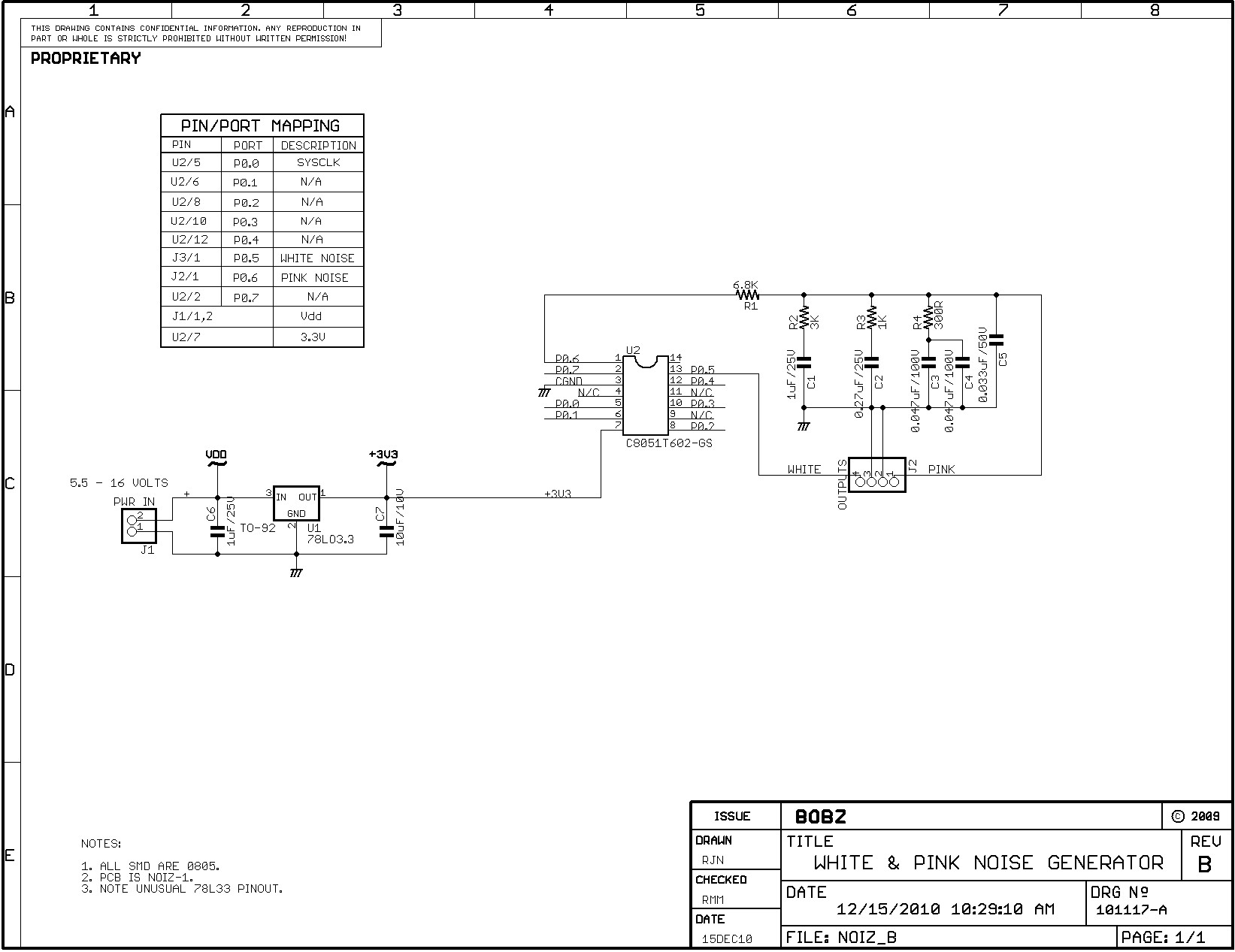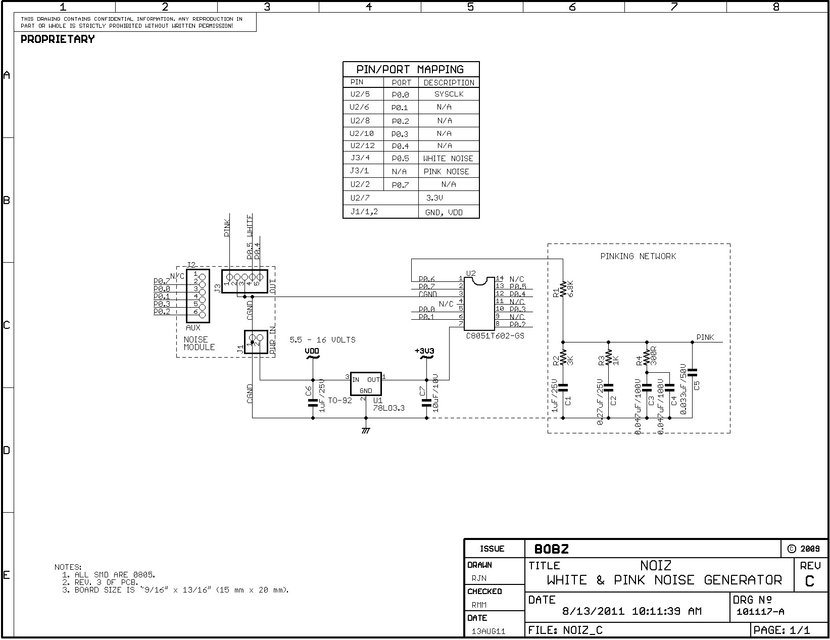 For the following, refer to Schematic 1 titled "NOIZ WHITE AND PINK NOISE GENERATOR." The schematic shows the components, circuitry and pinouts for the module. User's with older NOIZ modules with only 6 I/O pins please refer to the Schematic 2. You can download both NOIZ schematics as a zip file.