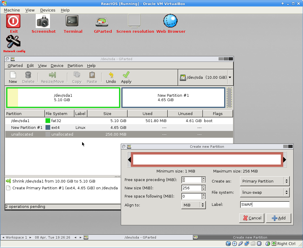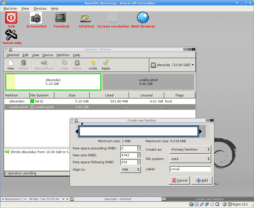 After you have re-sized the partition, you need to make Linux partitions in the unused space. The install tool can do this, but I prefer to make it using gparted, as it can be formatted and setup the way I like before we do the install. Select the unused space, select new, shrink the end value by about 1GB, as that will become your swap partition, and select a "ext4" format. Select the remainder of unused space and select a format of "swap" for it. You might consider labeling these partitions, as it could help later when trying to know what is what. Do the "apply" and it will create the "root" file partition and swap partition in quick order. At this point the drive is now setup and ready for installing Linux. I suggest rebooting off the Windows partition to just make sure all is well and ready for the next step.
